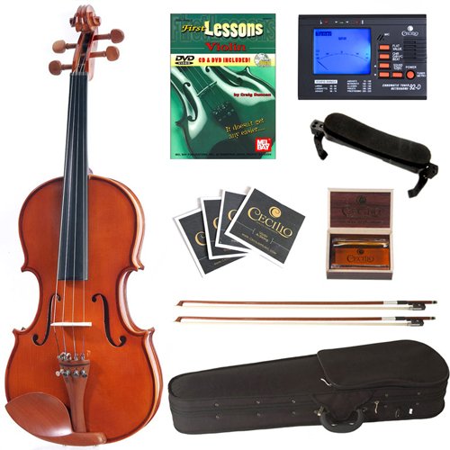 Teacher approved CVN-200 violin is a perfect for the student musicians. It features hand-carved solid spruce top, hand-carved maple back and sides finished with beautiful varnish and inlaid purfling. This violin is fitted with natural rosewood pegs, fingerboard (painted black), chin rest, and tailpiece with 4 detachable nickel plated fine tuners. Violin accessories include 2 (two) Brazilwood bow with ebony frog and unbleached genuine Mongolian horsehair, a lightweight form fitting hard shell case with pockets and strap (making it convenient to carry to school or orchestra), adjustable shoulder rest with soft foam padding & soft rubber feet, quality rosin cake, violin bridge and an extra set of violin strings. This package includes Cecilio 92D chromatic tuner and lesson book with DVD. Buy with confidence as it comes with a 1- year warranty against any manufacturer's defects.
