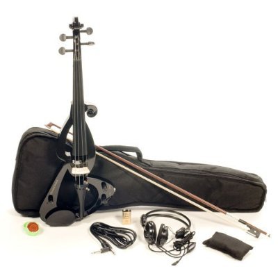 Complete Electric Violin package with Bow + Soft Shell Case + Earphones + Rosin + Amp Cable + 9V Battery.