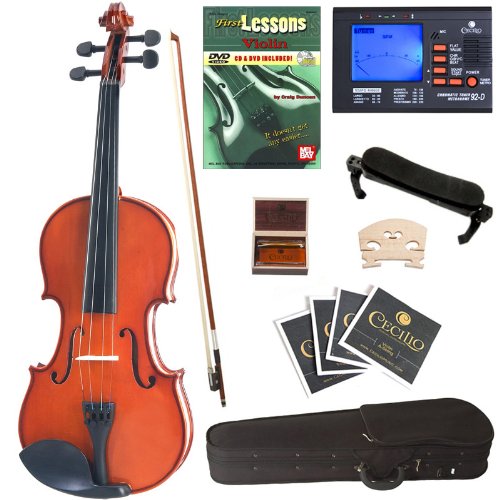 Teacher approved CVN-100 violin is a perfect for the student musicians. It features hand-carved solid spruce top, hand-carved maple back and sides finished with beautiful varnish and inlaid purfling. This violin is fitted with rosewood (painted black) pegs, fingerboard, chin rest, and alloy tailpiece with 4 built-in fine tuners. Violin accessories include a Brazilwood bow with unbleached genuine Mongolian horsehair, a lightweight form fitting hard shell case with pockets and strap (making it convenient to carry to school or orchestra), adjustable shoulder rest with soft foam padding & soft rubber feet, quality rosin cake, violin bridge and an extra set of violin strings. Buy with confidence as it comes with a 1- year warranty against any manufacturer's defects.
